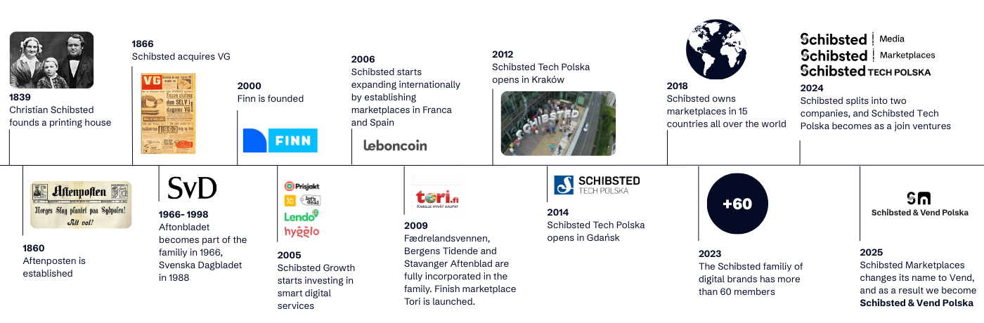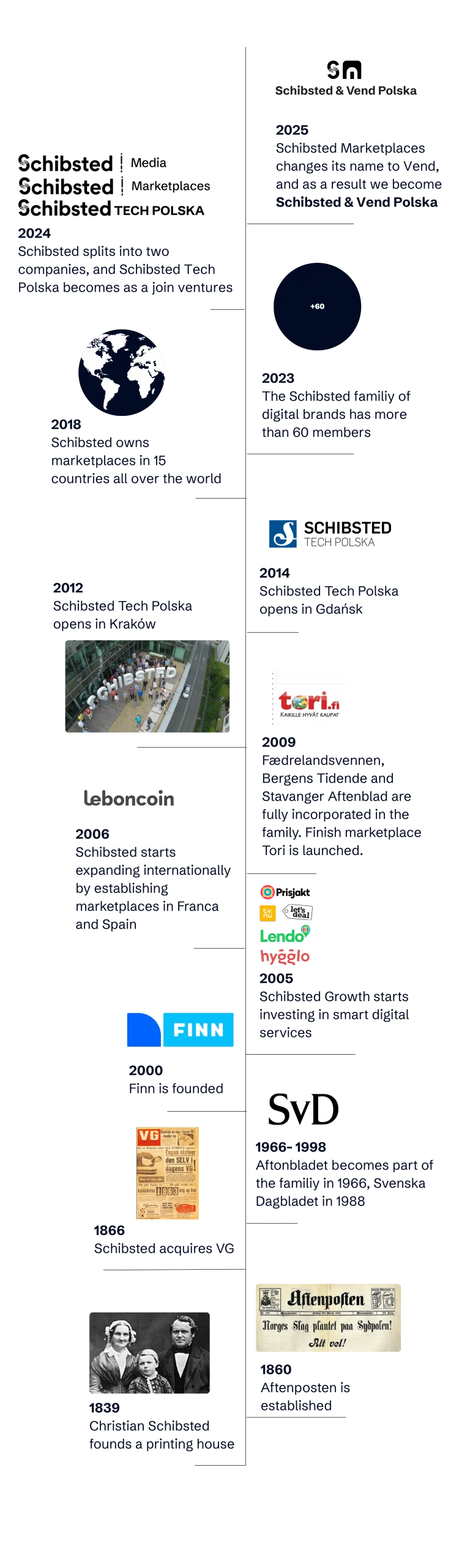The story of Schibsted & Vend Polska is rooted in over a decade of growth, collaboration and transformation — and in nearly two centuries of publishing and innovation from our parent companies.